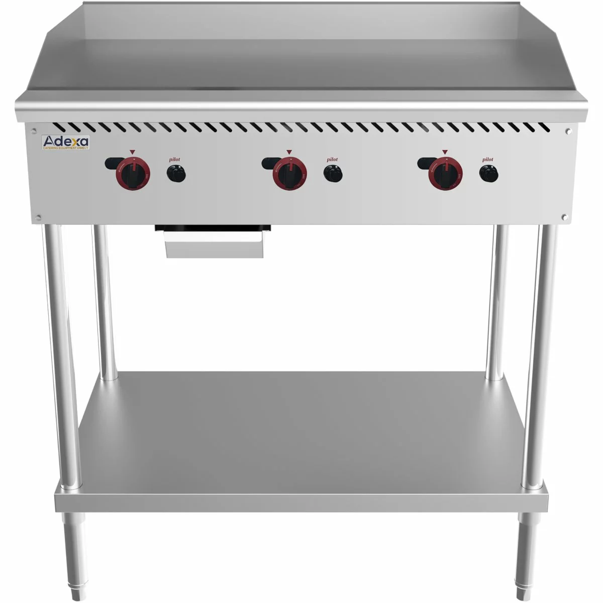 The Adexa freestanding gas griddle is the perfect addition to any professional catering establishment, whether you are cooking breakfast, lunch or dinner. Featuring 3 x 35000BTU/hr stainless steel burners with independent pilots, the griddle also includes an oil bin with baffle and an anti-splash enclosure for easy cleaning. The default configuration is natural gas with gas connection pipe and 3/4″ NPT thread included, but the griddle can be converted to an LPG gas supply to suit your requirements.