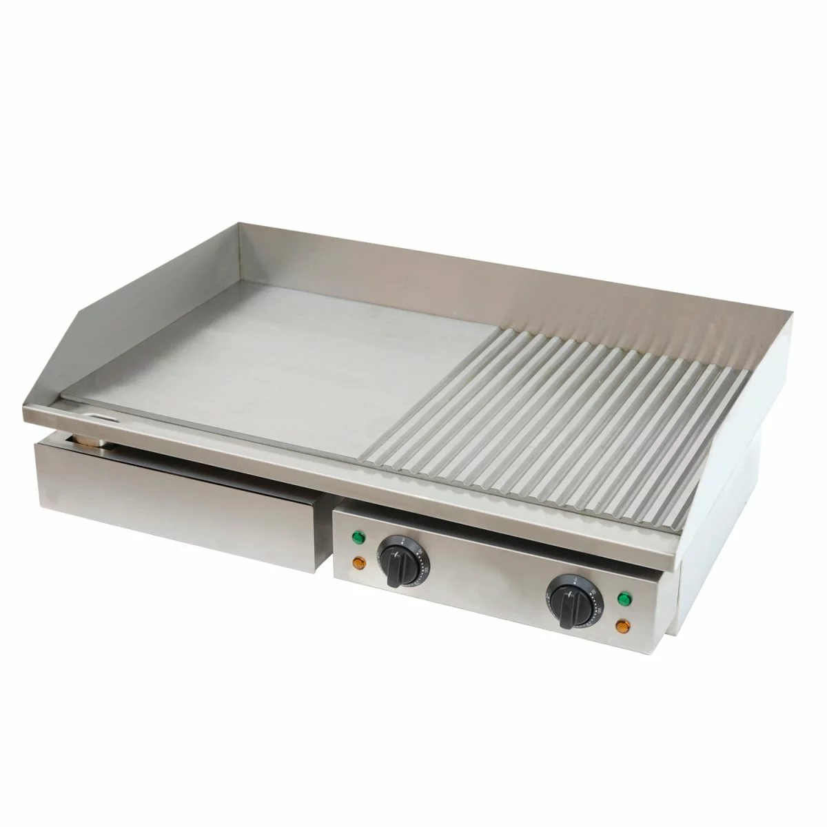 This professional griddle has been created with ease of use in mind – with simple controls, and make out of durable, high quality stainless steel. The griddle can heat up to 300°C, with a large cooking area of 728mm by 400mm, with 4000W of power culminating in a fantastic griddle for commercial kitchens. This model is split half smooth and half ribbed/grooved cooking area.
