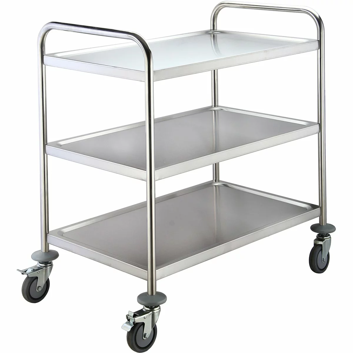 This serving trolley with three sturdy tray surfaces can seamlessly integrate itself anywhere. Thanks to its robust construction, it is particularly suitable for use in canteens, large-scale catering establishments, restaurants, public institutions, but also the private sector. With it serving meals or drinks, or clearing tables and taking the dishes to the kitchen becomes effortless. This stainless steel trolley is remarkably resistant and easy to clean.