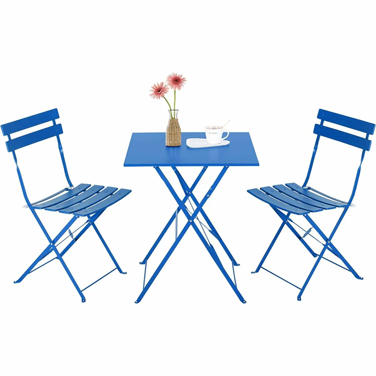 This is a 3 pieces table and chairs set. It has one folding table with 2 folding chairs. It will bring new life to your patio or deck with the table and chairs set. Its durable and steel frame provides a sturdy foundation for this delightful set. With its square tabletop and folding chairs, the table furniture set is a perfect way to enjoy a cafe-style experience right outside of your door. It will be simple for storage and transport for their folding feature. You can put it in your garden, patio or pool side as you want. Pick it for your home or your catering establishment!