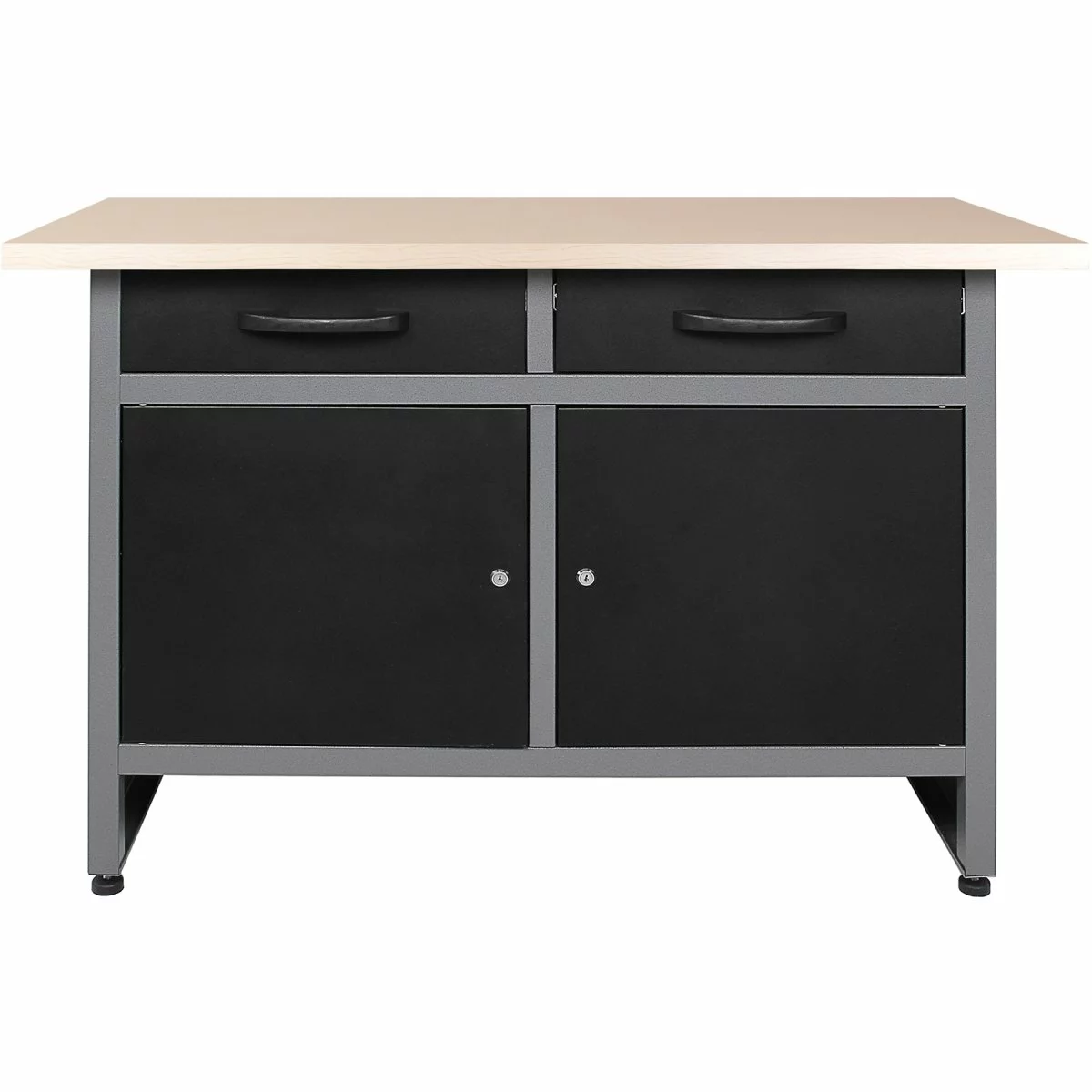 This heavy duty workbench has a sleek grey and black design, finished with a 30mm wooden desktop. Providing ample storage space, this workbench has 2 drawers and 2 lockable doors.