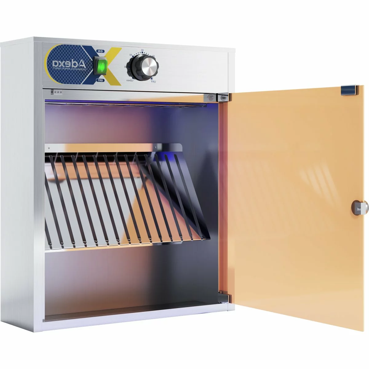 A commercial stainless steel knife cabinet which can hold up 15 knives, is designed to reduce cross contamination of knives in a catering or restaurant kitchen. Features adjustable timer and plexiglass door. UV light switches off automatically when door is open. Wall mounted.