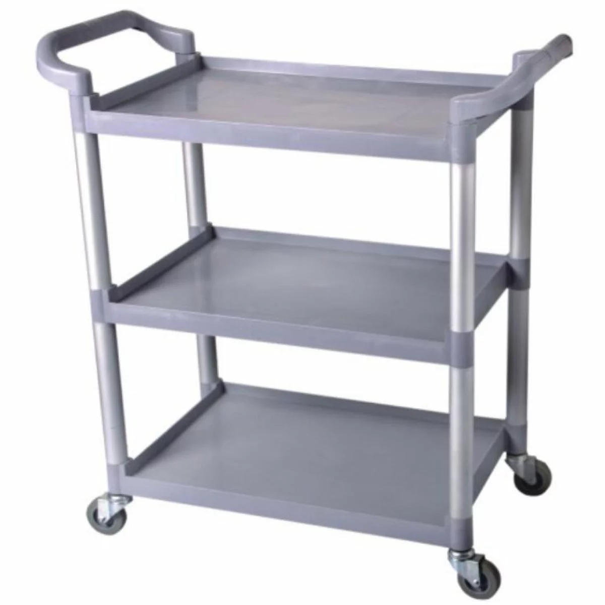 This commercial black multi-purpose utility cart combines front of the house appeal with back of the house durability. Sturdy, satin finished aluminum uprights provide exceptional support and minimize wear and tear from consistent usage. Featuring four swiver castors and brakes, this trolley can be transported with ease and safely locked in position. This versatile trolley can also be upgraded with the cutlery and refuse bin attachments (sold seperately), making this trolley practical for any restaurant, hotel or other catering establishment.